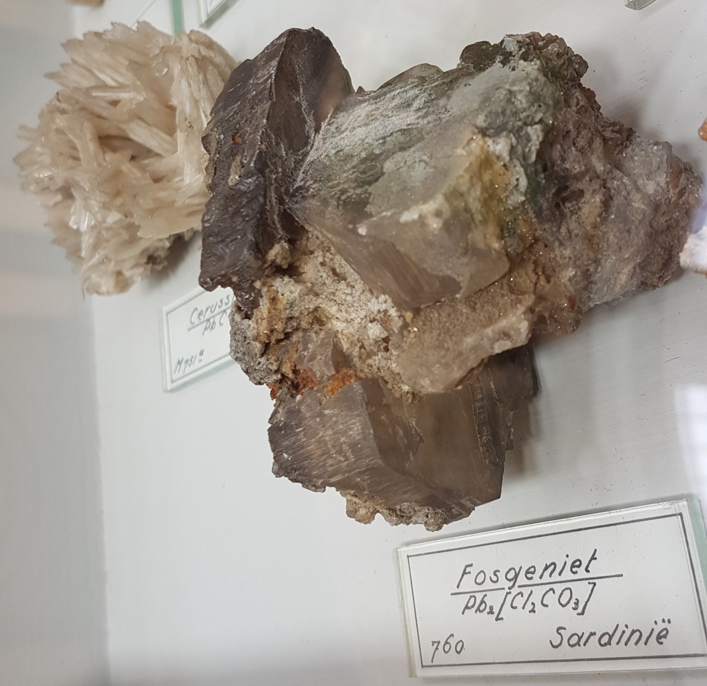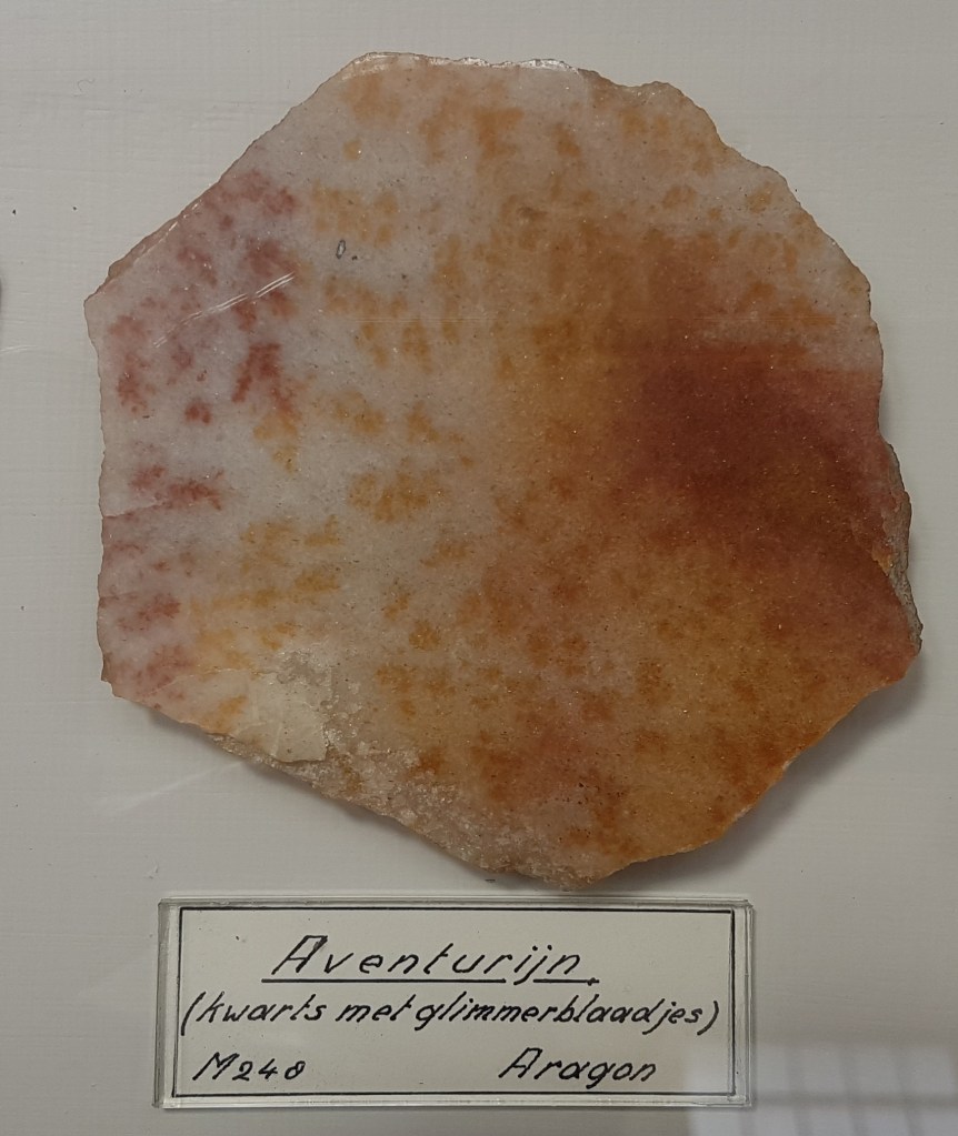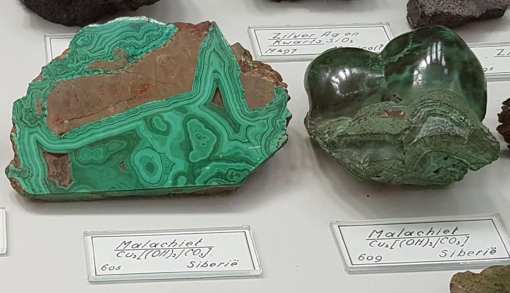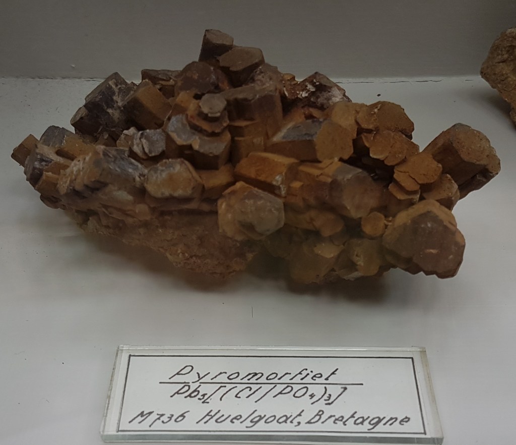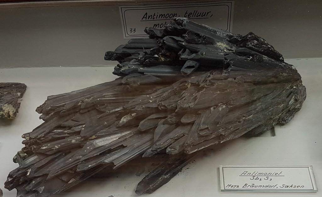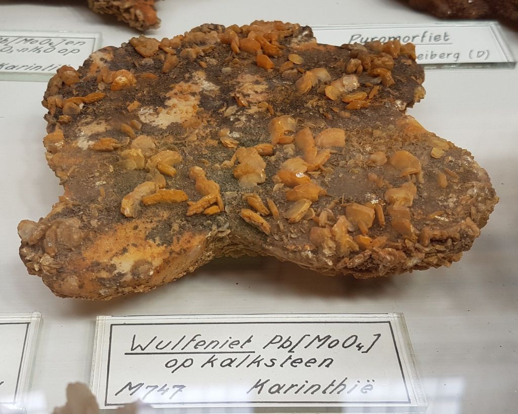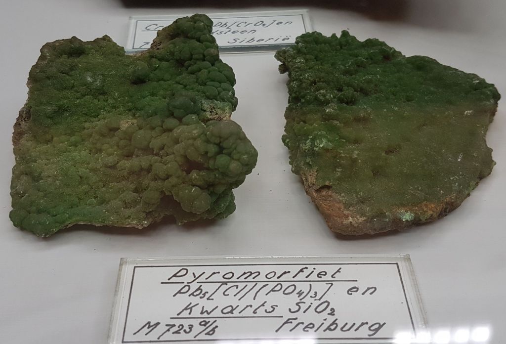 18- Sofre, Agrigent (Girgenti en sicilià), Sicília, Itàlia.19- Estibnita (“antimonita”), Bräunsdorf, Saxònia, Alemanya. Probablement prové de la mina Neue Hoffnung Gottes, d’on es varen recol·lectar exemplars similars a mitjan segle XIX.20- Nagyagita, Nagyág (nom hongarès de l’actual Săcărâmb), Zevenburgen (traducció al neerlandès de l’alemany Siebenbürgen que correspon a l’actual Transilvània), Romania.21- Rútil en quars, Castella, Espanya. Probablement prové de la localitat clàssica d’Horcajuelo de la Sierra, localitat tipus per aquest mineral, descrit l’any 1803 per Abrahan Gottlob Werner.22- Farmacosiderita, Cornualla (Cornwall), Anglaterra, Regne Unit. Exemplars molt semblants es varen extreure de la mina Wheal Gorland, a la parròquia de Gwennap (actualment es troba a la parròquia de St. Day). Aquesta antiga mina de coure es va començar a explotar l’any 1792.23- Wulfenita sobre pedra calcària, Caríntia, Àustria. Probablement prové de la zona minera de Bleiberg, on es van explotar des del segle XVI diverses mines de Pb i Zn en un entorn sedimentari de calcàries triàsiques.24- Fosgenita, Sardenya, Itàlia. La localitat clàssica de les fosgenites sardes es troba a Monteponi, a l’antiga regió minera d’Iglesias (Igrèsias en sard).25- Piromorfita, Huelgoat, Châteaulin, Finisterre, Bretanya, França. Amb força seguretat, de les antigues mines de plom que es trobaven a aquesta localitat.26 / 27- Piromorfita, Freiburg, Alemanya. Probablement es tracta de la regió de Friburg, Baden-Württemberg, Alemanya, i molt probablement del districte miner de Schauinsland, on es varen explotar des de l’antiguitat mines de plom i de zinc, i d’on es varen extreure exemplars remarcables de piromorfita.28- Samarskita, Arendal, Agder, Noruega. Prové de les antigues mines de ferro que es varen explotar en aquesta localitat.29- Pechblenda, Jáchymov (Joachimsthal antigament, en alemany), Txèquia. Exemplar provinent d’aquest antic districte miner famós per les mines d’argent començades a explotar l’any 1512. En aquestes mines va treballar com a metge en Georgius Agricola, autor del llibre De re metallica. En aquestes mines eren abundants també els minerals d’urani, explotats posteriorment. A finals del segle XIX la pechblenda es considerava un residu i tones d’aquest mineral van ser processats pel matrimoni Curie, descobrint el poloni i el radi.30- Torbernita, Shinkolobwe, R.D. del Congo. Mines d’urani descobertes l’any 1915. D’aquest jaciment es va extreure urani per al projecte Manhattan i la producció de la bomba atòmica que es va llençar sobre Hiroshima.31- Cassiterita, Cornualla (Cornwall), Anglaterra, Regne Unit. La mineria al comtat de Cornualla comença a l’edat del bronze i modernament va ser un dels principals productors mundials d’estany i coure.32- Cinabri, Almadén, Ciudad Real, Castella-La Manxa, Espanya. No podia faltar un exemplar d’aquesta localitat clàssica espanyola.33- Liroconita, Cornualla (Cornwall), Anglaterra, Regne Unit. Mineral descrit l’any 1801. La localitat tipus és Wheal Gorland, a St. Day, Cornwall.34- Argent, Kongsberg, Noruega. Un clàssic d’aquesta localitat noruega, on es va explotar l’argent des del 1623 fins el 1958, extraient-se més d’1,3 milions de kg d’argent.35- Aventurina (quars amb mica fullosa), Aragon (Aragó, Espanya?). L’aventurina és una varietat de quarsita que conté fragments brillants (generalment mica), hematites i altres, que es pot tallar i polir com a pedra preciosa. No he trobat cap referència a aquesta pedra a la comunitat autònoma d’Aragó.36- Malaquita, Sibèria, Rússia. Amb la malaquita siberiana es va decorar l’anomenada Sala de Malaquita al Palau d’Hivern a Sant Petersburg, antiga residència dels tsars i actualment seu principal del Museu de l’Hermitage. Per al revestiment de les seves pilastres, columnes i xemeneies es van utilitzar 2.200 quilos de malaquita “de la millor qualitat” regalats a l’emperador pel ric empresari rus Demidov, propietari de les mines de coure descobertes en els anys 1830 a Nizhnii Tagil i a Polevskoy (mina Gumeshevskii), a Sverdlovsk (Urals).37- Àgata “bretxa” (?), Espanya. Àgata polida de procedència espanyola, segons l’etiqueta.