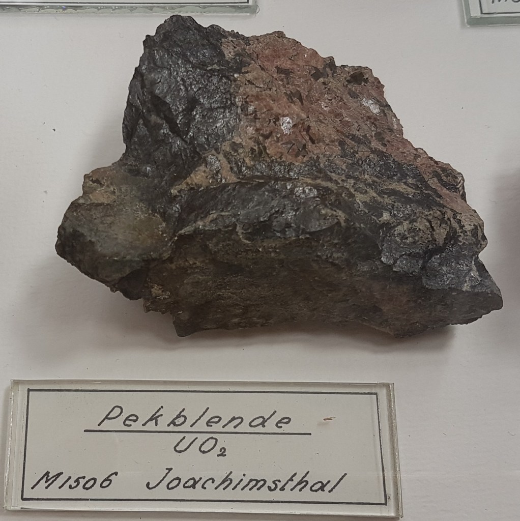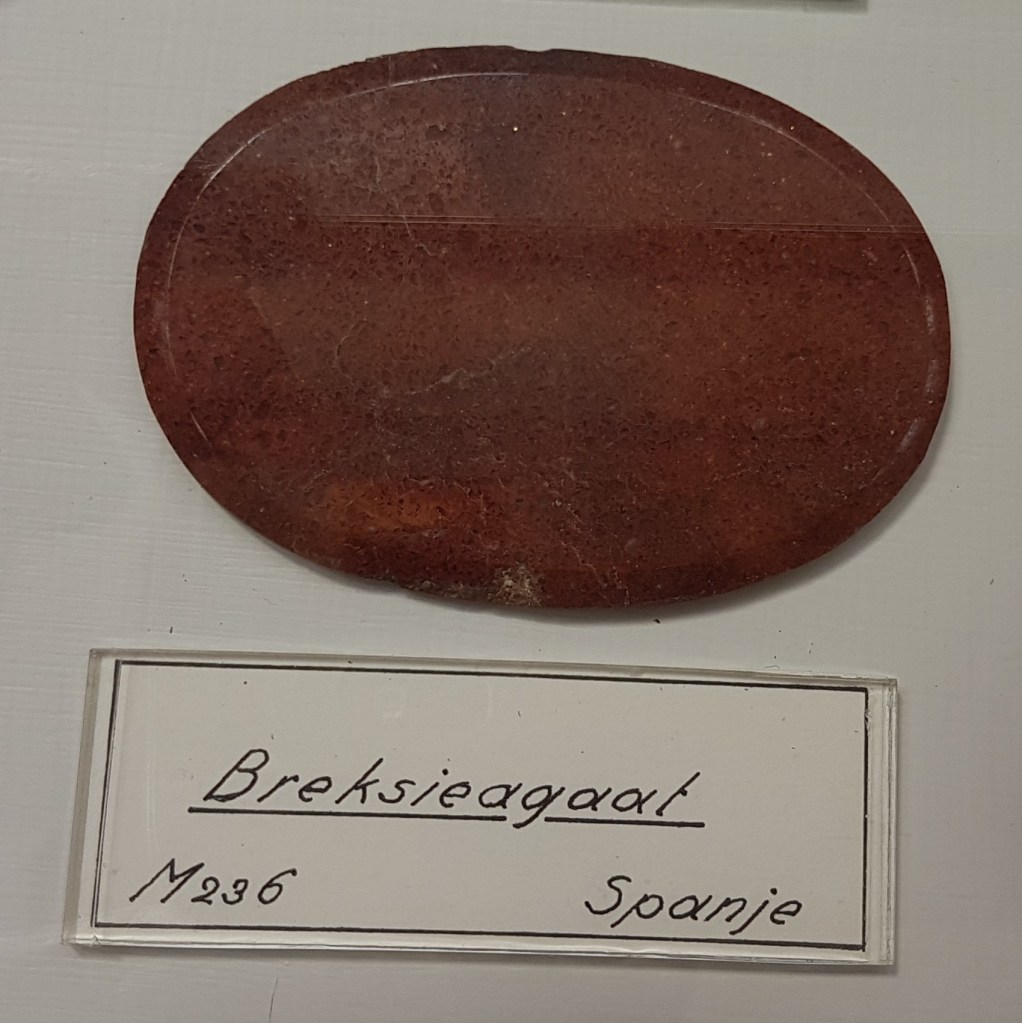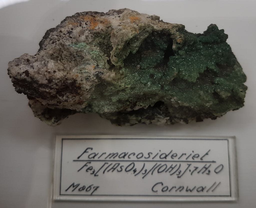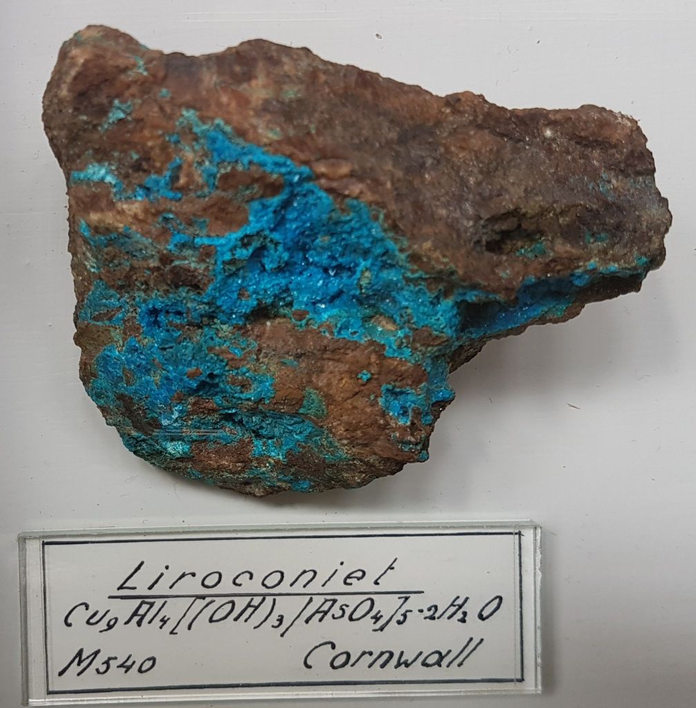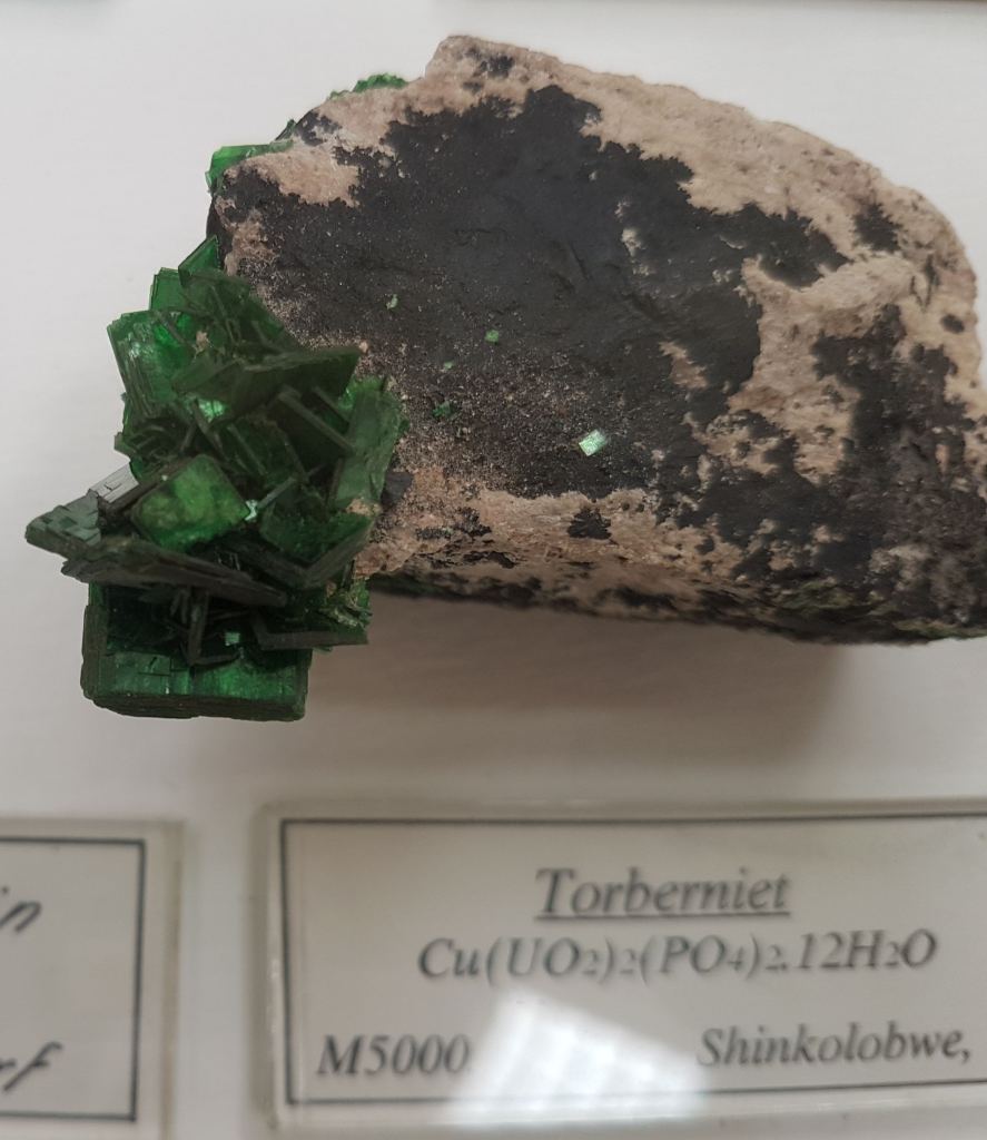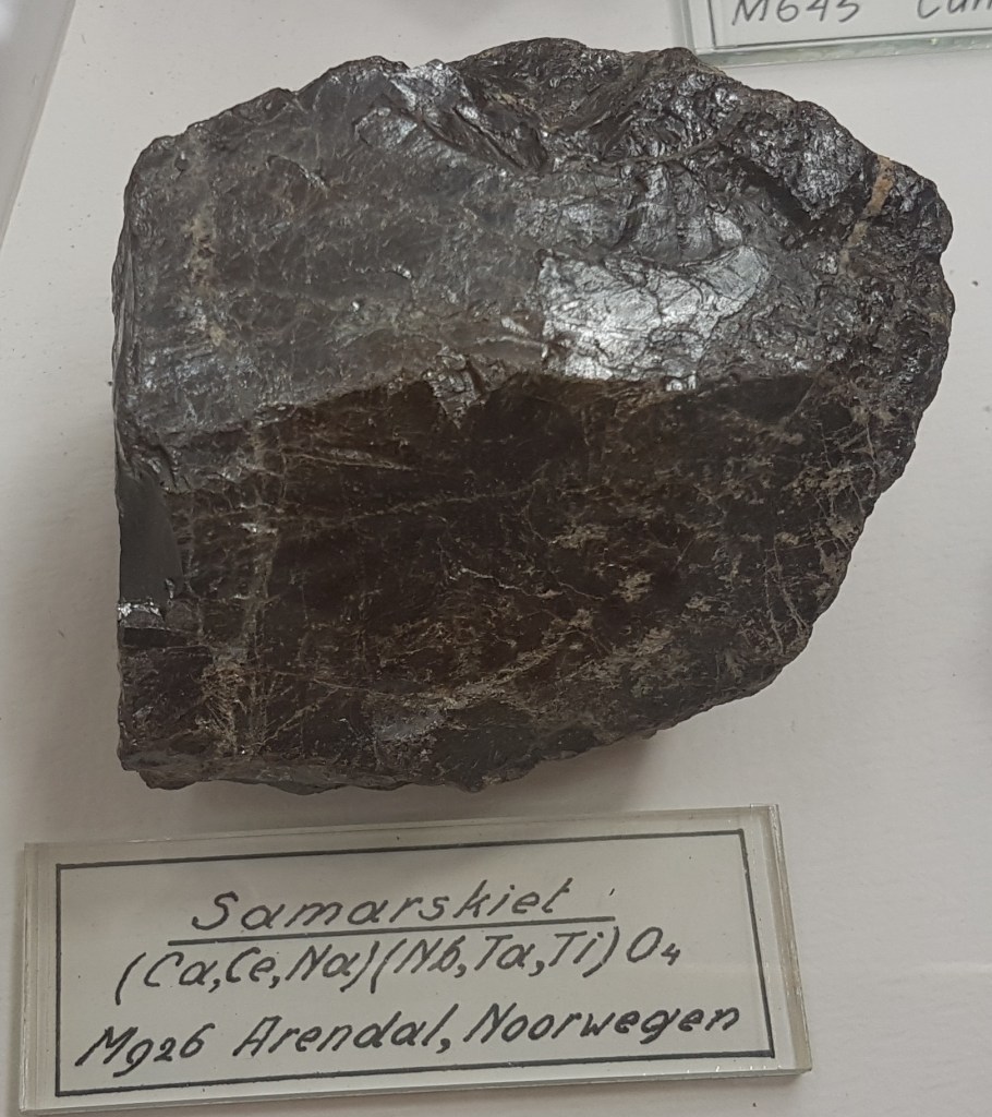 18- Sofre, Agrigent (Girgenti en sicilià), Sicília, Itàlia.19- Estibnita (“antimonita”), Bräunsdorf, Saxònia, Alemanya. Probablement prové de la mina Neue Hoffnung Gottes, d’on es varen recol·lectar exemplars similars a mitjan segle XIX.20- Nagyagita, Nagyág (nom hongarès de l’actual Săcărâmb), Zevenburgen (traducció al neerlandès de l’alemany Siebenbürgen que correspon a l’actual Transilvània), Romania.21- Rútil en quars, Castella, Espanya. Probablement prové de la localitat clàssica d’Horcajuelo de la Sierra, localitat tipus per aquest mineral, descrit l’any 1803 per Abrahan Gottlob Werner.22- Farmacosiderita, Cornualla (Cornwall), Anglaterra, Regne Unit. Exemplars molt semblants es varen extreure de la mina Wheal Gorland, a la parròquia de Gwennap (actualment es troba a la parròquia de St. Day). Aquesta antiga mina de coure es va començar a explotar l’any 1792.23- Wulfenita sobre pedra calcària, Caríntia, Àustria. Probablement prové de la zona minera de Bleiberg, on es van explotar des del segle XVI diverses mines de Pb i Zn en un entorn sedimentari de calcàries triàsiques.24- Fosgenita, Sardenya, Itàlia. La localitat clàssica de les fosgenites sardes es troba a Monteponi, a l’antiga regió minera d’Iglesias (Igrèsias en sard).25- Piromorfita, Huelgoat, Châteaulin, Finisterre, Bretanya, França. Amb força seguretat, de les antigues mines de plom que es trobaven a aquesta localitat.26 / 27- Piromorfita, Freiburg, Alemanya. Probablement es tracta de la regió de Friburg, Baden-Württemberg, Alemanya, i molt probablement del districte miner de Schauinsland, on es varen explotar des de l’antiguitat mines de plom i de zinc, i d’on es varen extreure exemplars remarcables de piromorfita.28- Samarskita, Arendal, Agder, Noruega. Prové de les antigues mines de ferro que es varen explotar en aquesta localitat.29- Pechblenda, Jáchymov (Joachimsthal antigament, en alemany), Txèquia. Exemplar provinent d’aquest antic districte miner famós per les mines d’argent començades a explotar l’any 1512. En aquestes mines va treballar com a metge en Georgius Agricola, autor del llibre De re metallica. En aquestes mines eren abundants també els minerals d’urani, explotats posteriorment. A finals del segle XIX la pechblenda es considerava un residu i tones d’aquest mineral van ser processats pel matrimoni Curie, descobrint el poloni i el radi.30- Torbernita, Shinkolobwe, R.D. del Congo. Mines d’urani descobertes l’any 1915. D’aquest jaciment es va extreure urani per al projecte Manhattan i la producció de la bomba atòmica que es va llençar sobre Hiroshima.31- Cassiterita, Cornualla (Cornwall), Anglaterra, Regne Unit. La mineria al comtat de Cornualla comença a l’edat del bronze i modernament va ser un dels principals productors mundials d’estany i coure.32- Cinabri, Almadén, Ciudad Real, Castella-La Manxa, Espanya. No podia faltar un exemplar d’aquesta localitat clàssica espanyola.33- Liroconita, Cornualla (Cornwall), Anglaterra, Regne Unit. Mineral descrit l’any 1801. La localitat tipus és Wheal Gorland, a St. Day, Cornwall.34- Argent, Kongsberg, Noruega. Un clàssic d’aquesta localitat noruega, on es va explotar l’argent des del 1623 fins el 1958, extraient-se més d’1,3 milions de kg d’argent.35- Aventurina (quars amb mica fullosa), Aragon (Aragó, Espanya?). L’aventurina és una varietat de quarsita que conté fragments brillants (generalment mica), hematites i altres, que es pot tallar i polir com a pedra preciosa. No he trobat cap referència a aquesta pedra a la comunitat autònoma d’Aragó.36- Malaquita, Sibèria, Rússia. Amb la malaquita siberiana es va decorar l’anomenada Sala de Malaquita al Palau d’Hivern a Sant Petersburg, antiga residència dels tsars i actualment seu principal del Museu de l’Hermitage. Per al revestiment de les seves pilastres, columnes i xemeneies es van utilitzar 2.200 quilos de malaquita “de la millor qualitat” regalats a l’emperador pel ric empresari rus Demidov, propietari de les mines de coure descobertes en els anys 1830 a Nizhnii Tagil i a Polevskoy (mina Gumeshevskii), a Sverdlovsk (Urals).37- Àgata “bretxa” (?), Espanya. Àgata polida de procedència espanyola, segons l’etiqueta.
